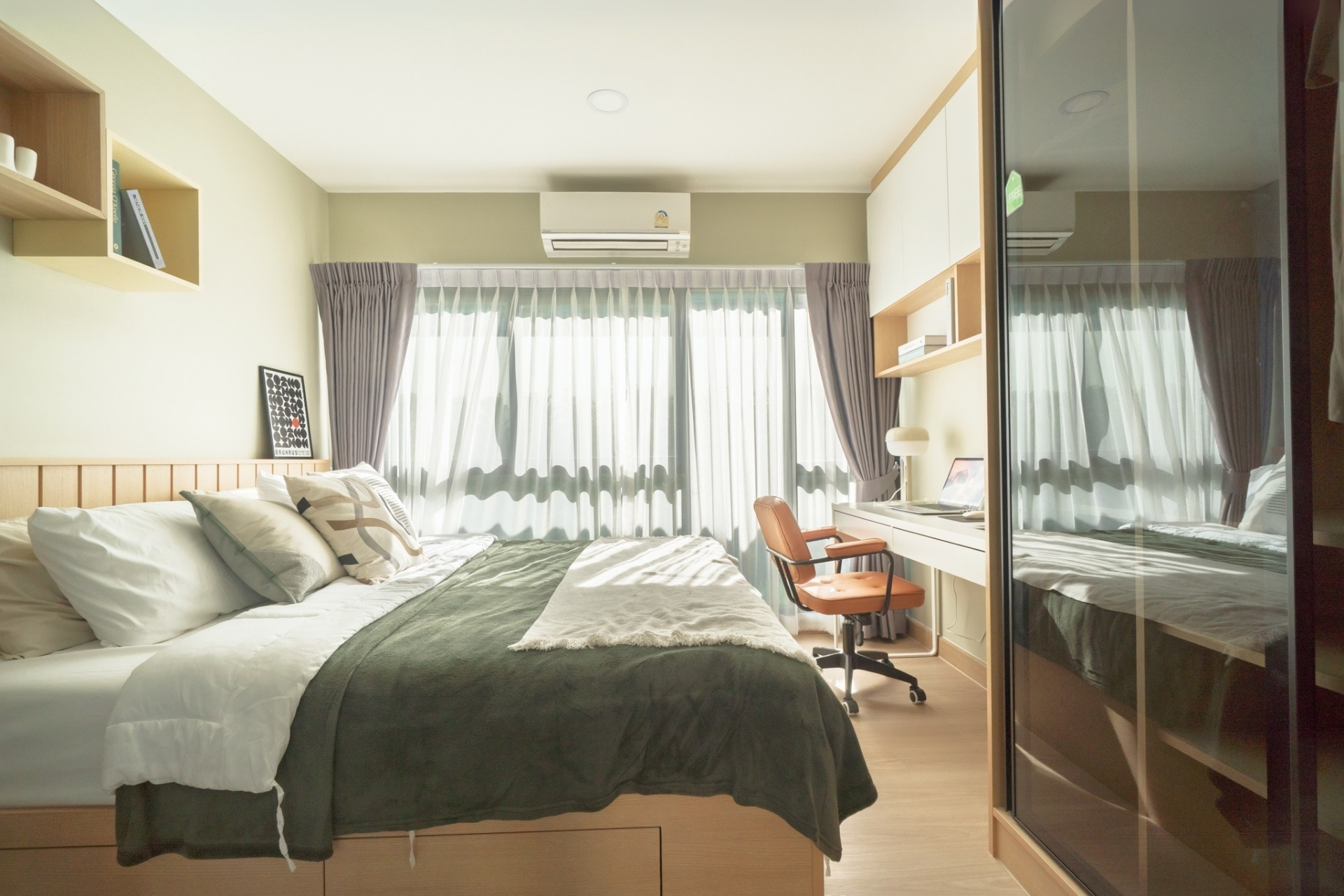 ถัดไปอีกห้องเป็นห้องนอนที่ไม่ได้มีแค่ห้องเปล่า ๆ แต่โครงการจัดให้ตั้งแต่แอร์ ม่าน ตู้เสื้อผ้า เตียง ฟูก ขาดแค่หมอนและผ้าปูที่นอนก็อยู่ได้เลย สมกับคำว่า Fully-furnished อย่างแท้จริง