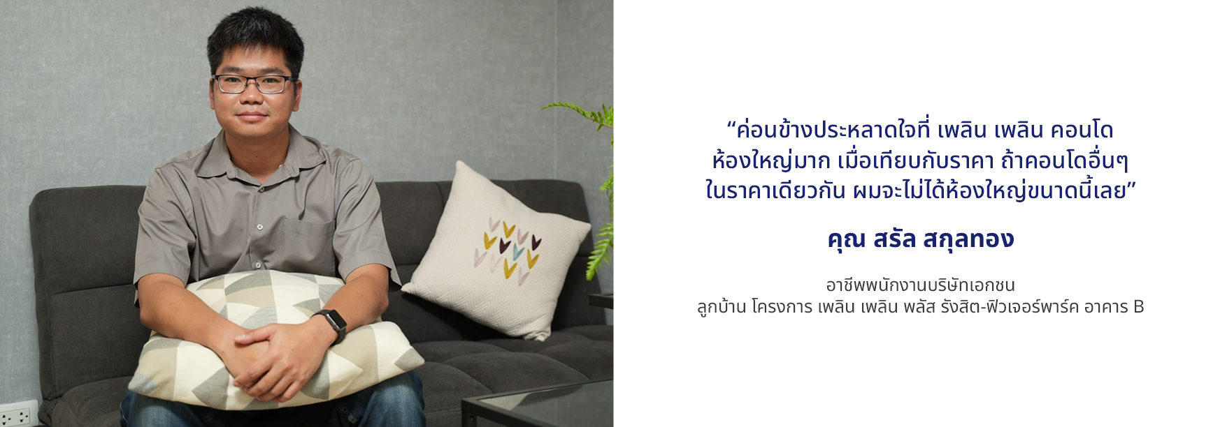 คุณ สรัล สกุลทอง บอกเองว่า ตอนแรกก็ไม่รู้จัก เพลิน เพลิน มาก่อน แต่พอไปเสิร์ชหาข้อมูลคอนโดแถวรังสิต-ฟิวเจอร์พาร์ค ก็ค่อนข้างประหลาดใจที่ เพลิน เพลิน คอนโดมิเนียม ห้องใหญ่มาก เมื่อเทียบกับราคา ถ้าเป็นคอนโดอื่นๆ ในราคาเดียวกัน จะไม่ได้ห้องใหญ่ขนาดนี้ และเมื่อตัดสินใจมาชมห้องตัวอย่างก็ชอบ ตรงปก จึงตัดสินใจจอง และเมื่อถึงวันที่ได้ย้ายเข้าอยู่จริงก็ไม่ผิดหวัง