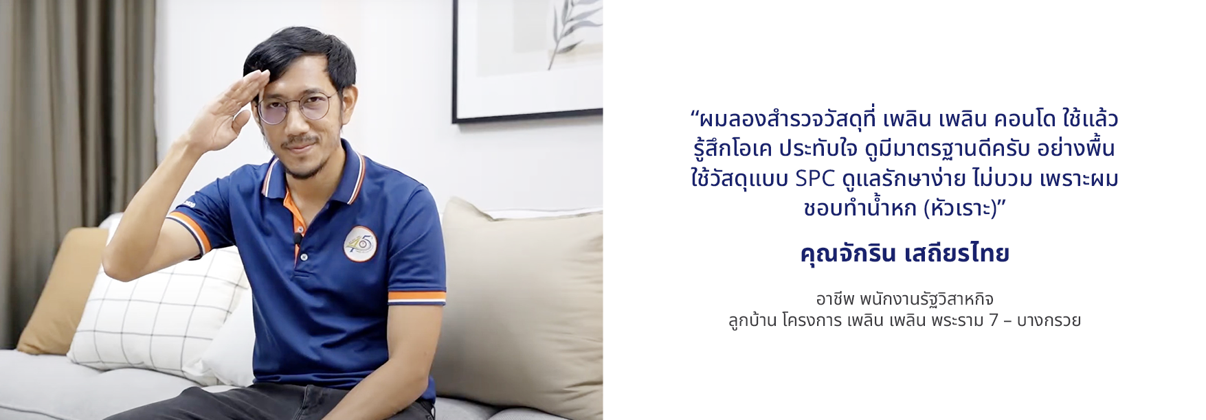 "ผมลองสำรวจวัสดุที่ เพลิน เพลิน คอนโด ใช้แล้วรู้สึกโอเค ประทับใจ ดูมีมาตรฐานดีครับ อย่างพื้นใช้วัสดุแบบ SPC ดูแลรักษาง่าย ไม่บวม เพราะผมชอบทำน้ำหก (หัวเราะ)"