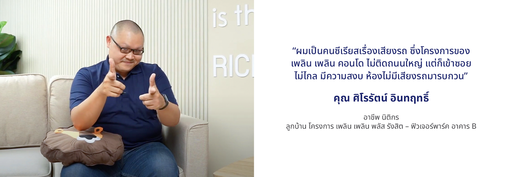 "ผมเป็นคนซีเรียสเรื่องเสียงรถ ซึ่งโครงการของเพลิน เพลิน คอนโด ไม่ติดถนนใหญ่ แต่ก็เข้าซอยไม่ไกล มีความสงบ ห้องไม่มีเสียงรถมารบกวน"